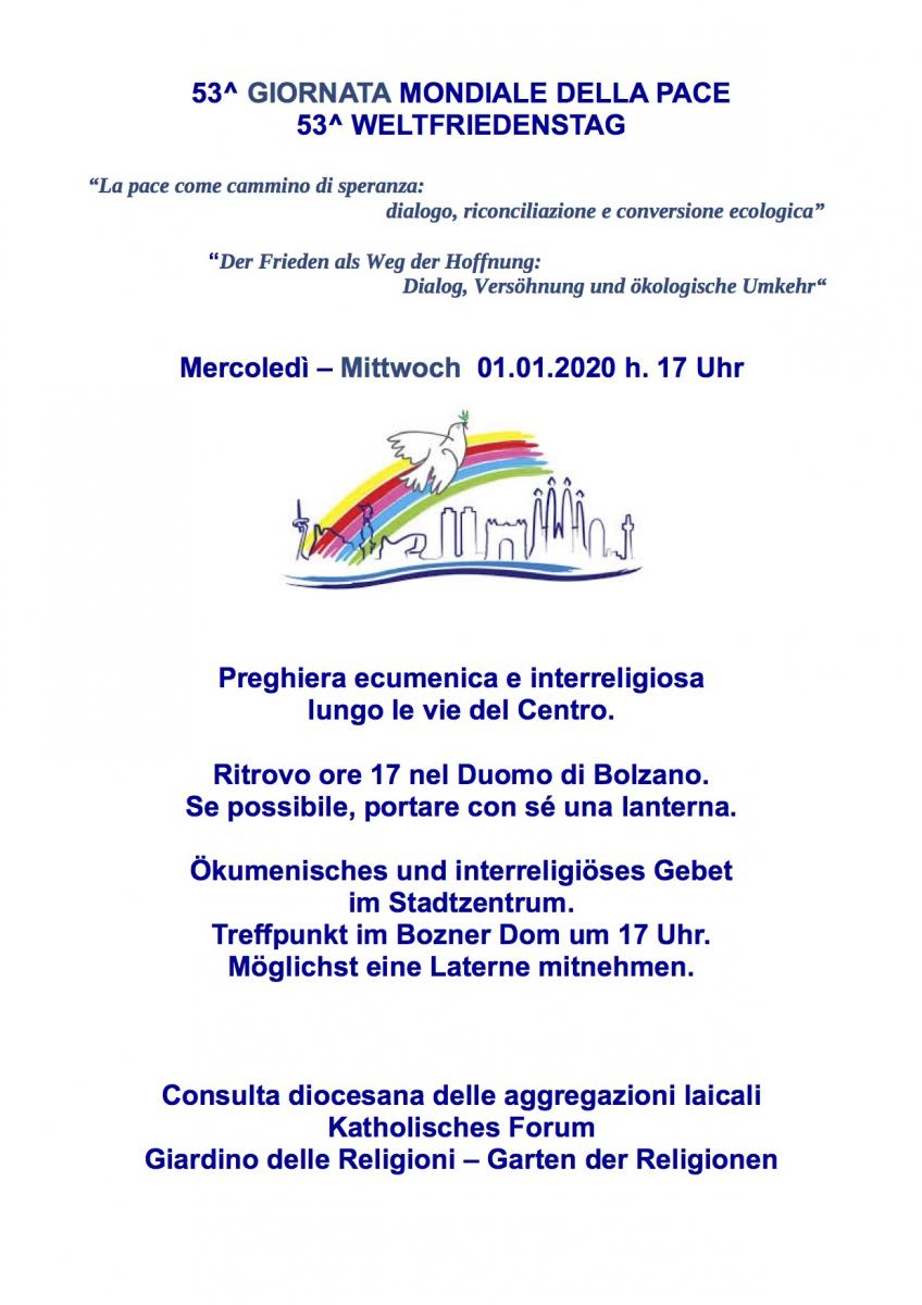 La Consulta diocesana delle Aggregazioni laicali, il Katholisches Forum, l’Ufficio per l’ecumenismo e il dialogo interreligioso e il Giardino delle Religioni invitano alla preghiera ecumenica e interreligiosa per la pace che si terrà mercoledì 1° gennaio 2020 con inizio alle ore 17.00 nel duomo di Bolzano, continuerà con una processione silenziosa lungo le vie del Centro e  terminerà nella chiesa di San Domenico.  Si consiglia di portare con sé una lanterna che verrà accesa alla luce di Betlemme.